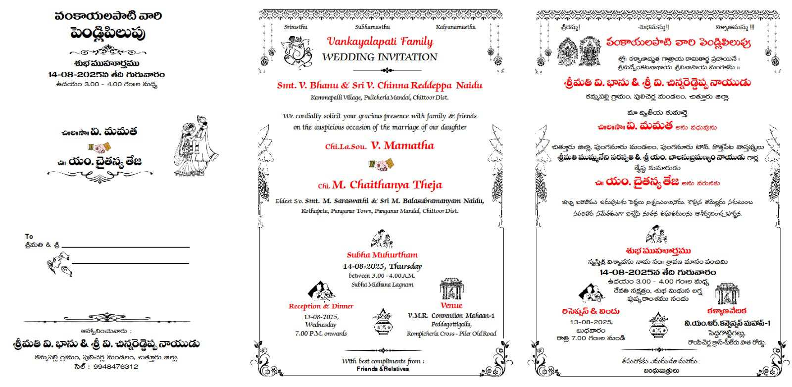 Reception : 13th Aug 2025 -7pm Onwards Wedding : 14th Aug 2025 -3 to 4am
